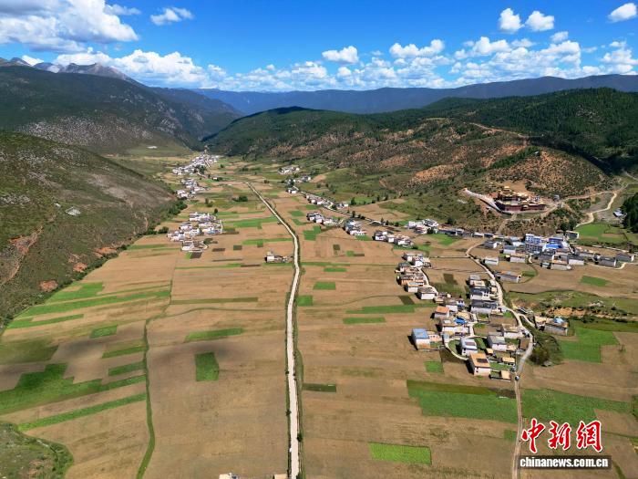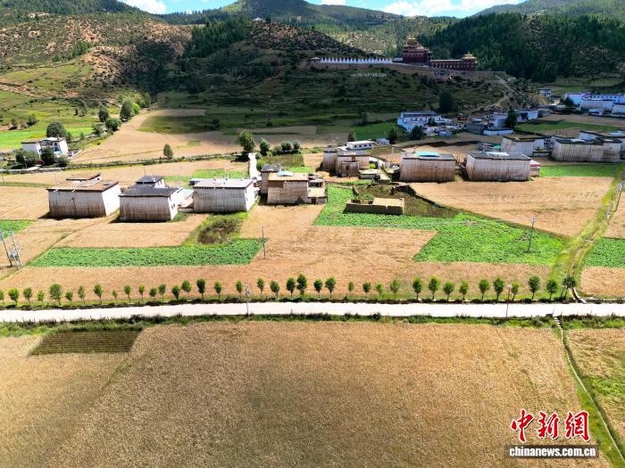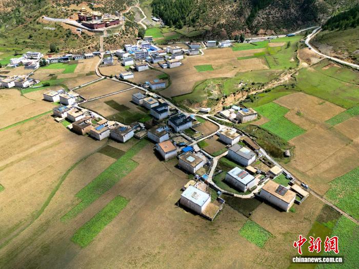 9月14日,始春时令,4川省苦孜州城乡县正斗村千亩青稞老练,便将迎去支割。村内乱1栋栋黑匿房取成片青稞相应死辉,组成1幅川西桑梓绘卷。(无人机相片)中新社记者 弛浪 摄
